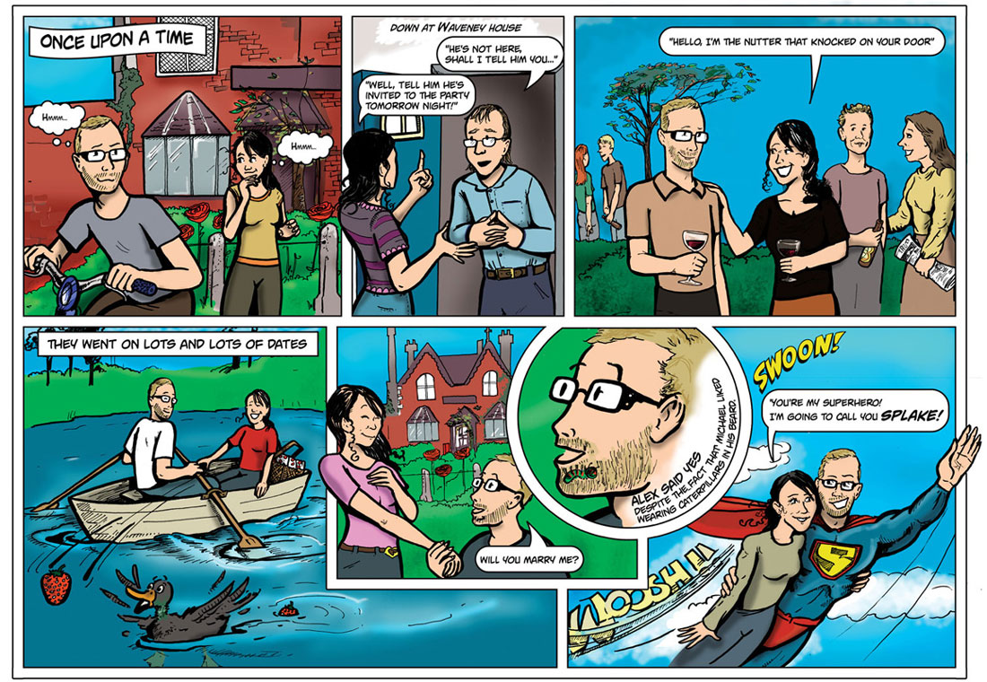 Comic request from a woman who wanted to have a gift that showed the courtship of her and her husband, in an Archie comic-esque style.